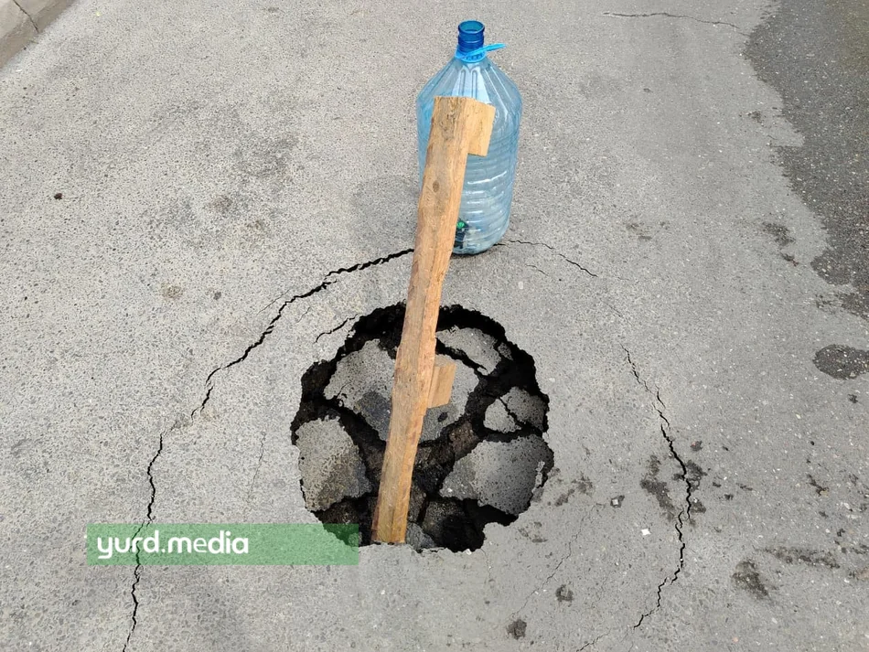 Asfaltın dağılan hissəsi ətrafında mühafizə zolağı qurulub, xəbərdarlıq nişanı qoyulub. Hazırda araşdırma aparılır: