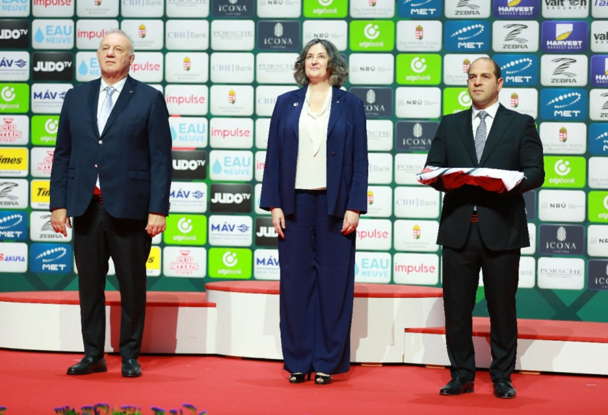 Bayrağı Azərbaycan Cüdo Federasiyasının vitse-prezidenti, Olimpiya çempionu Elnur Məmmədli qəbul edib. Mərasimdə Avropa Cüdo Birliyinin prezidenti Laslo Tot, Beynəlxalq Cüdo Federasiyasının baş katibi Liza Allan və digər rəsmilər iştirak ediblər.
