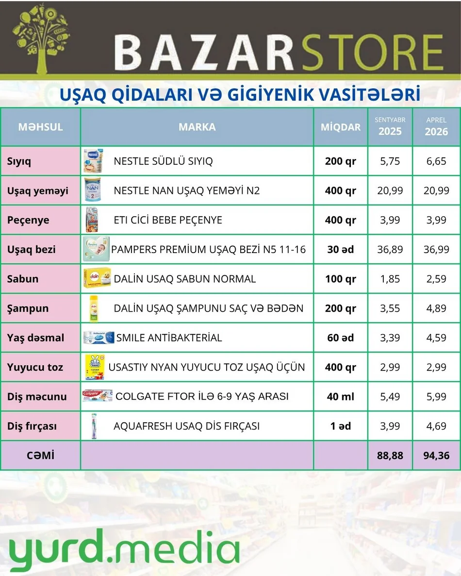Yurd.Media bu səbəbdən ölkənin aparıcı market şəbəkələrində bu kateqoriyadan olan məhsulların müqayisəli qiymət cədvəlini hazırlayıb. Hazırki infoqrafikada "Bazarstore" şəbəkəsindəki mağazalarda uşaq yeməkləri (sıyıq, peçenye), uşaqların gündəlik qulluğunda geniş istifadə olunan bez, sabun, şampun, yaş dəsmal, yuyucu toz, diş məcunu və fırçasının ən çox tələbat görən çeşidləri üzrə qiymətlər əks etdirilib.