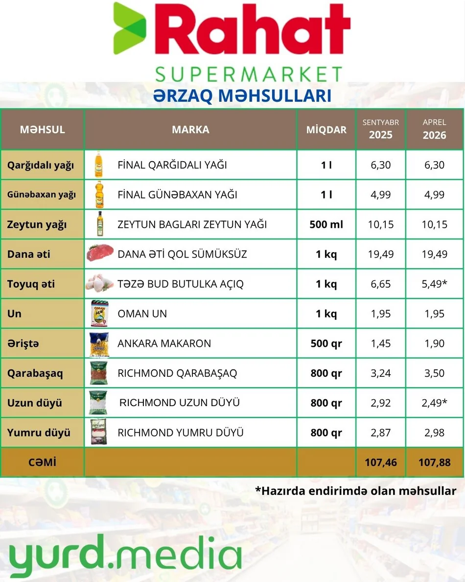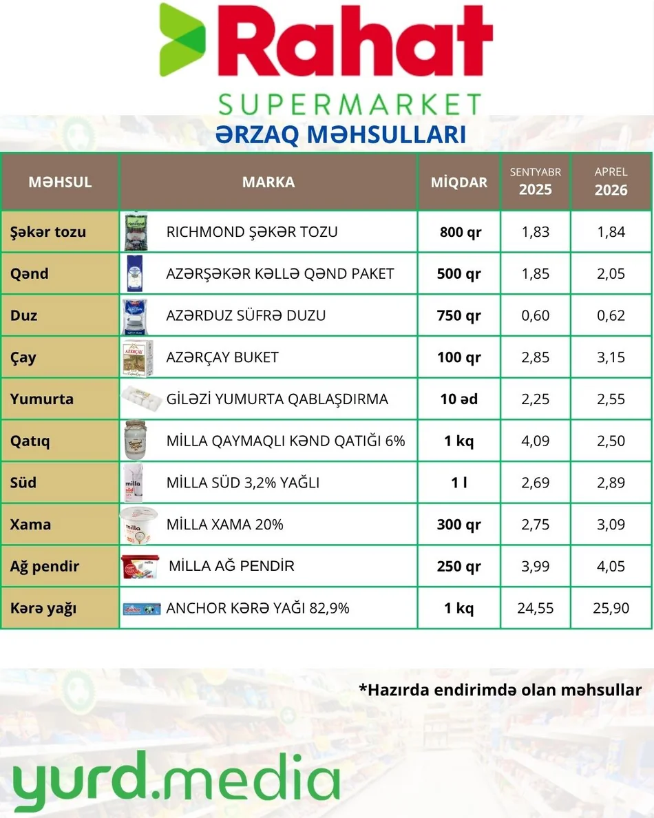 Ərzaq bazarında baş verən qiymət dəyişikliklərini oxuculara daha aydın şəkildə təqdim etmək üçün Yurd.Media növbəti monitorinqini həyata keçirib. Araşdırma ölkənin iri pərakəndə satış şəbəkələrindən biri olan “Rahat” marketlərində formalaşan qiymətlər əsasında hazırlanıb.