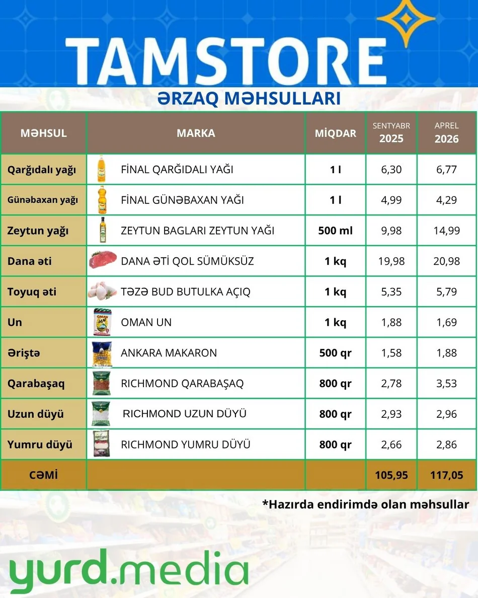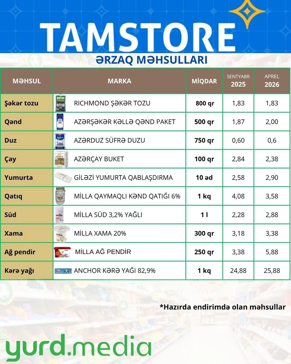 Əhalinin istehlak səbətində mühüm yer tutan ərzaq məhsullarının qiymət dəyişikliklərini izləmək üçün Yurd.Media növbəti müqayisəli təhlilini təqdim edir. Araşdırma “Tamstore” marketlər şəbəkəsindəki qiymətlər əsasında formalaşdırılıb.
