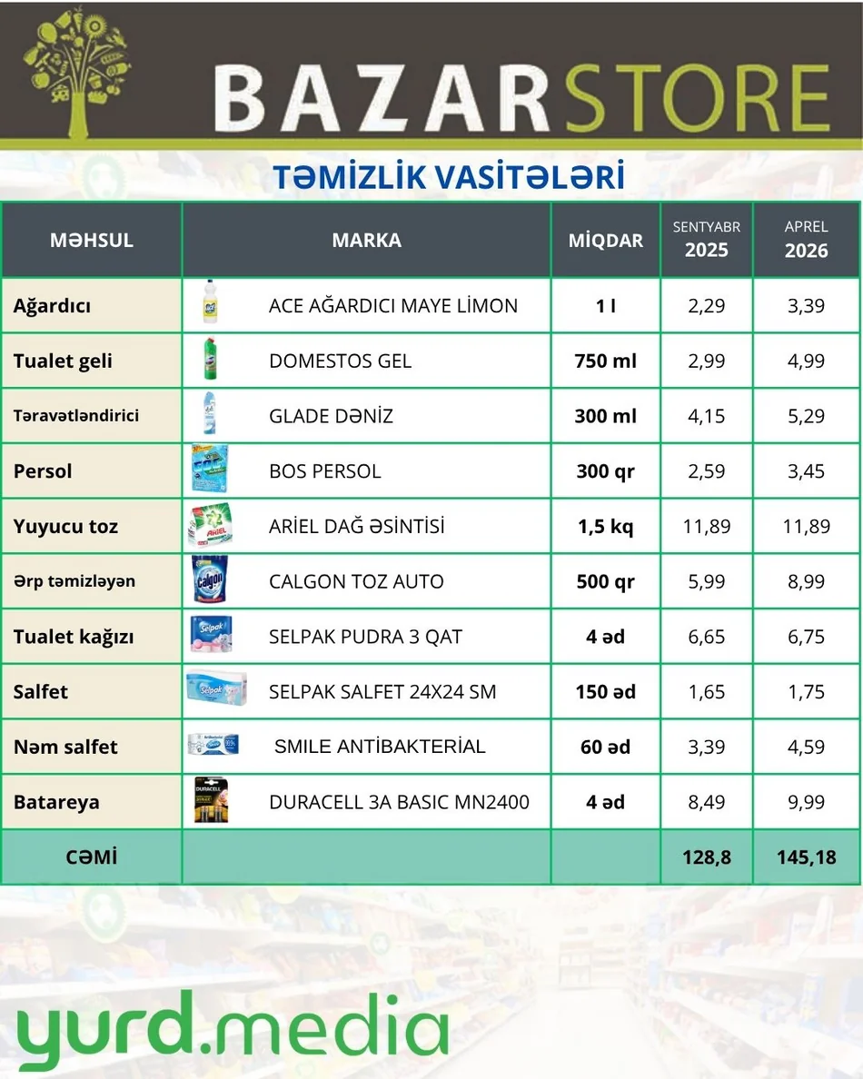 Yurd.Media ölkənin aparıcı marketlər şəbəkələrində bu kateqoriya üzrə qiymətlərin müqayisəli təhlilini təqdim edir. İldə iki dəfə hazırlanan infoqrafikalarda təmizlik vasitələrinin 6 aylıq və illik qiymət dinamikası əks olunur.