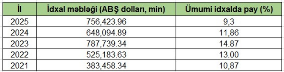 Müqayisə üçün qeyd edək ki, 2024-cü ilin yanvar-aprel aylarında bu göstərici 648 milyon 094,89 min dollarla ümumi idxalda 11,86% paya sahib olub.Son dörd ilin məlumatlarına nəzər saldıqda, 2023-cü ildə nəqliyyat vasitələri və onların hissələrinə 787 milyon 739,34 min dollar xərclənib, ümumi idxalda payı isə 14,87% təşkil edib.