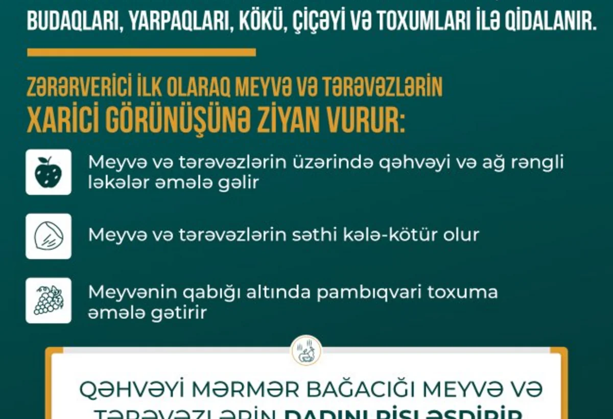 Tədbirdə qəhvəyi mərmər bağacığı ilə mübarizə tədbirləri haqqında danışılaraq bildirilib ki, fevral ayında zərərverici qışlama mərhələsindən çıxmağa hazırlaşır. Qəhvəyi mərmər bağacığı qış fəslini çardaqlarda, anbarlarda, boş tikililərdə və ağac qabıqlarının altında keçirir. Bu baxımdan həmin sığınacaqların vaxtında təmizlənməsi, həşəratların toplanaraq mexaniki üsulla məhv edilməsi ilə bağlı tədbirlərin gücləndirilməsi tövsiyə olunur.