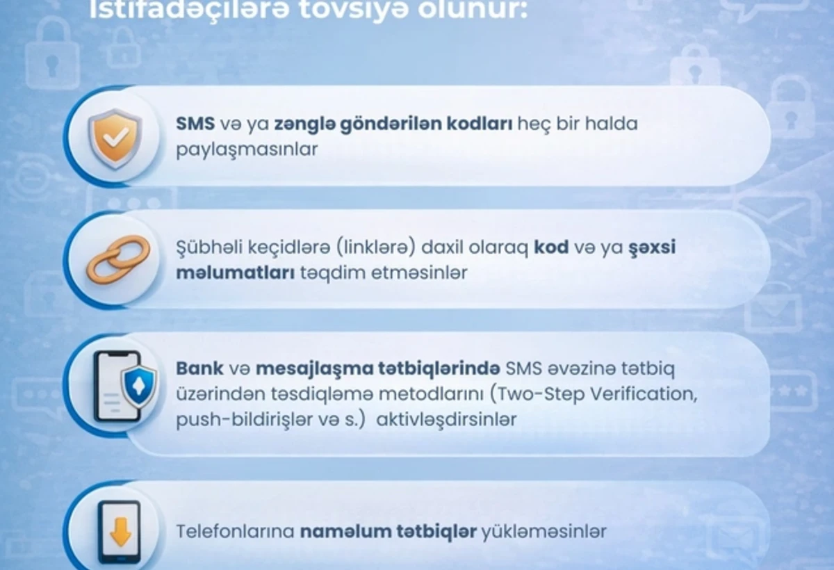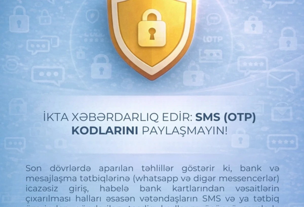 İnformasiya Kommunikasiya Texnologiyaları Agentliyi (İKTA) heç bir bank, dövlət qurumu, mobil operator və ya mesajlaşma tətbiqi istifadəçidən SMS kodunu tələb etmir. Belə zənglər və mesajlar dələduzluq məqsədi daşıyır.