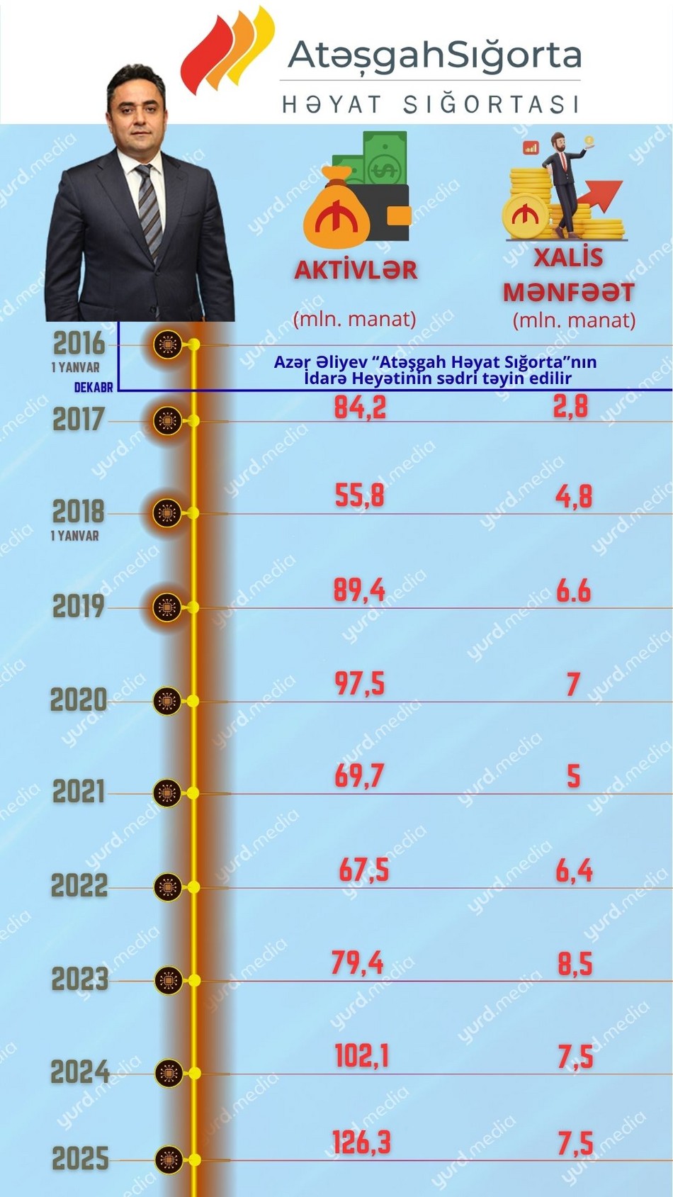A.Əliyevin dövründə “Atəşgah Həyat Sığorta”nın aktivləri ümumilikdə 50% artıb. Əgər 2016-cı ilin yekununda şirkət 84,2 milyon manat aktivlərə malik olubsa, bu rəqəm 2017-ci ilin yekununda 55,8 milyon manat, 2018-ci ilin yekununda 89,4 milyon manat, 2019-cu ilin yekununda 97,5 milyon manat, 2020-ci ilin yekununda 69,7 milyon manat, 2021-ci ilin yekununda 67,5 milyon manat, 2022-ci ilin yekununda 79,4 milyon manat, 2023-cü ilin yekununda 102,1 milyon manat, 2024-cü ilin yekununda isə 126,3 milyon manat təşkil edib.