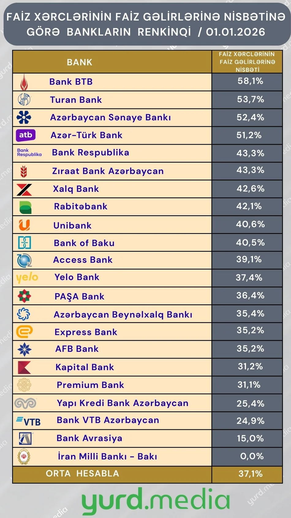 2025-ci ildə Azərbaycan banklarının cəmi faiz xərcləri onların cəmi faiz gəlirlərinin 37,1%-i qədər olub.