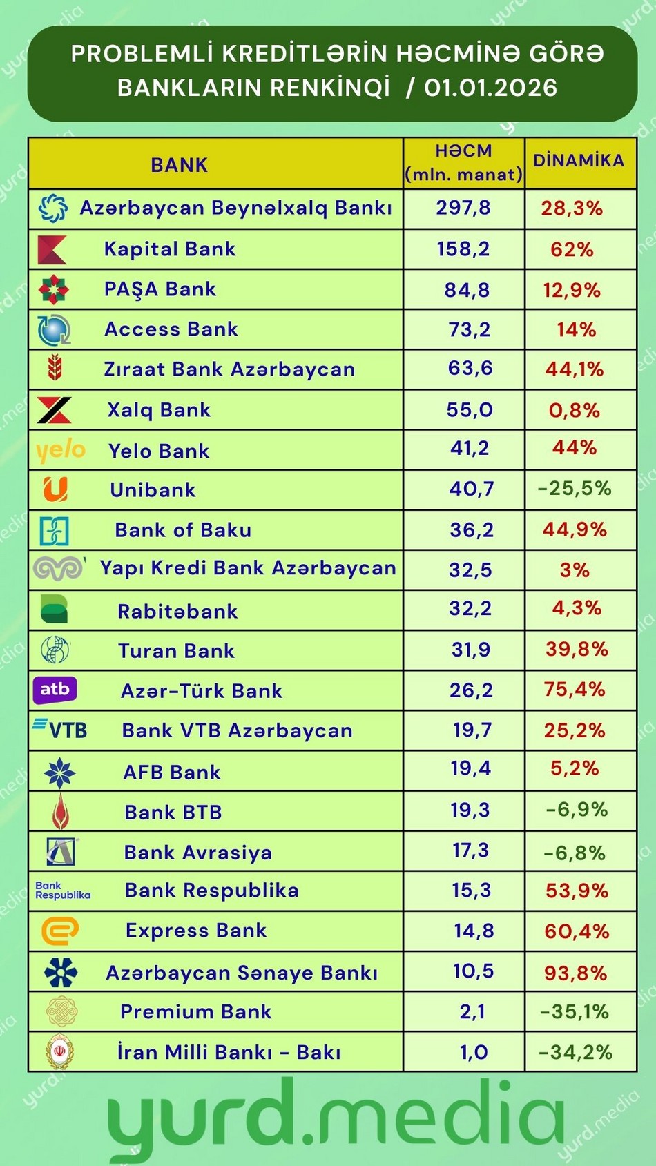 Yurd.Media xəbər verir ki, bunlar, “Azərbaycan Beynəlxalq Bankı” (297,8 milyon manat), “Kapital Bank” (158,2 milyon manat), “PAŞA Bank” (84,8 milyon manat), “Access Bank” (73,2 milyon manat) və “Ziraat Bank Azərbaycan”dır (63,6 milyon manat).