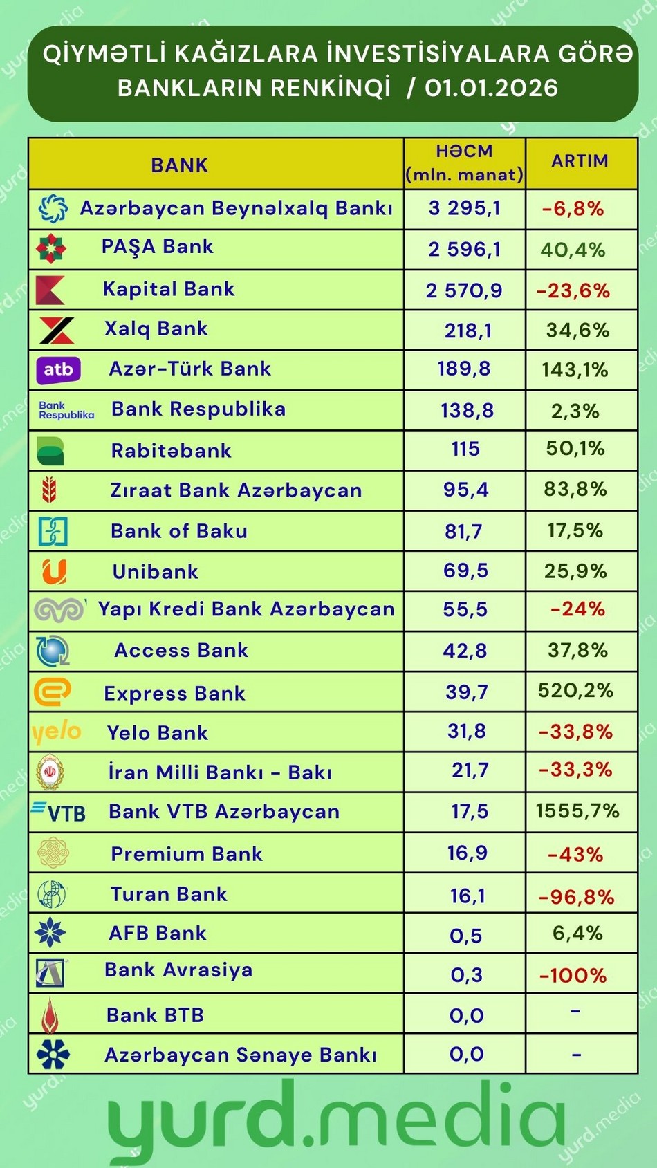 Yurd.Media xəbər verir ki, bunlar, “Azərbaycan Beynəlxalq Bankı” (3 295,1 milyon manat), “PAŞA Bank” (2 596,1 milyon manat), “Kapital Bank” (2 570,9 milyon manat), “Xalq Bank” (218,1 milyon manat) və “Azər-Türk Bank”dır (189,8 milyon manat).