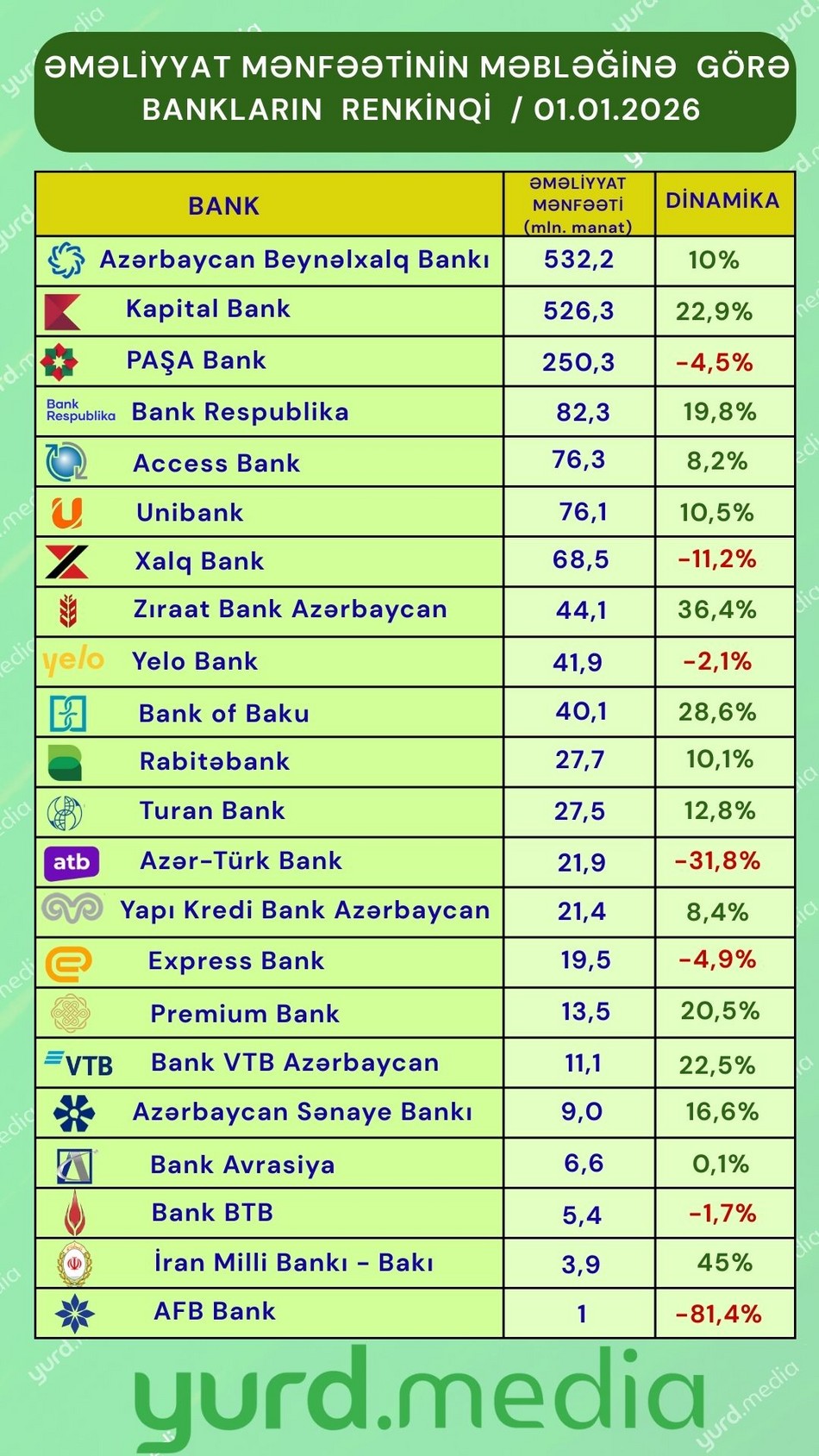Son 1 ildə 22 bankdan 7-nin əməliyyat mənfəəti azalıb. Qalan 15 bankın isə əməliyyat mənfəəti artıb. Ən yüksək dinamika İran Milli Bankında Bakı filialında (45%), ən aşağı dinamika isə “Bank Avrasiya”da (0,1%) qeydə alınıb.