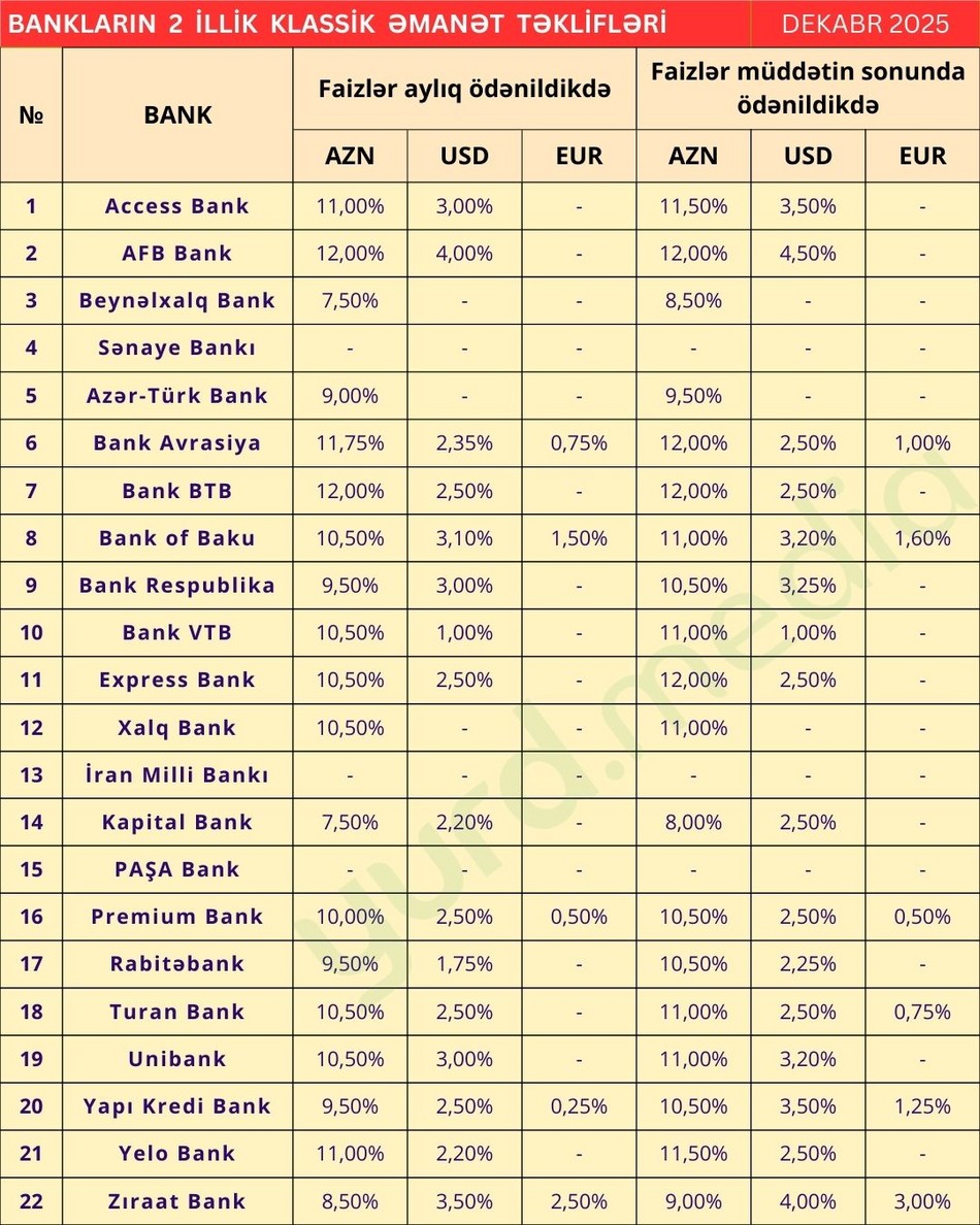 Qeyd edək ki, "PAŞA Bank", "Sənaye Bankı" və "İran Milli Bankı"nın əmanət təklifləri mövcud deyil.