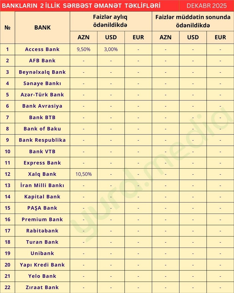 "AFB Bank", "Bank Avrasiya", "Kapital Bank", "Yelo Bank"."Bank of Baku", "Bank VTB", "Turan Bank", "Bank Respublika", "Yapı Kredi Bank", "Bank BTB", "Beynəlxalq Bank", "Express Bank", "Azər-Türk Bank", "Premium Bank", "PAŞA Bank", "Sənaye Bankı", "Rabitəbank", "Unibank", "Zıraat Bank" və "İran Milli Bankı"nın bu əmanət üzrə təklifləri mövcud deyil.