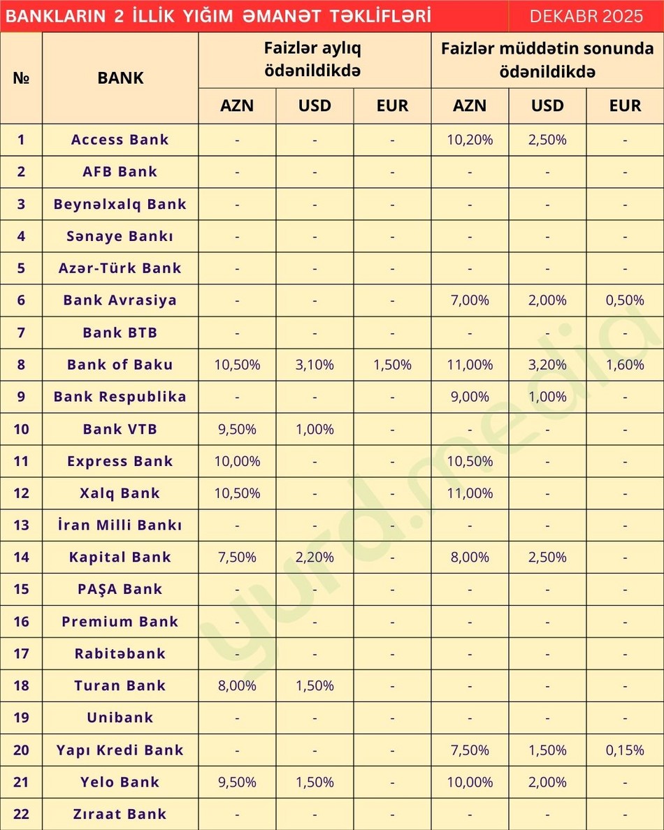 Yurd.Media Azərbaycan banklarının 2 illik yığım əmanəti təkliflərini araşdırıb.