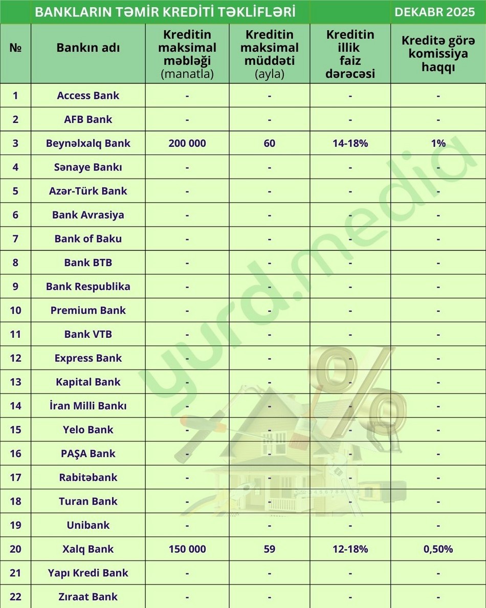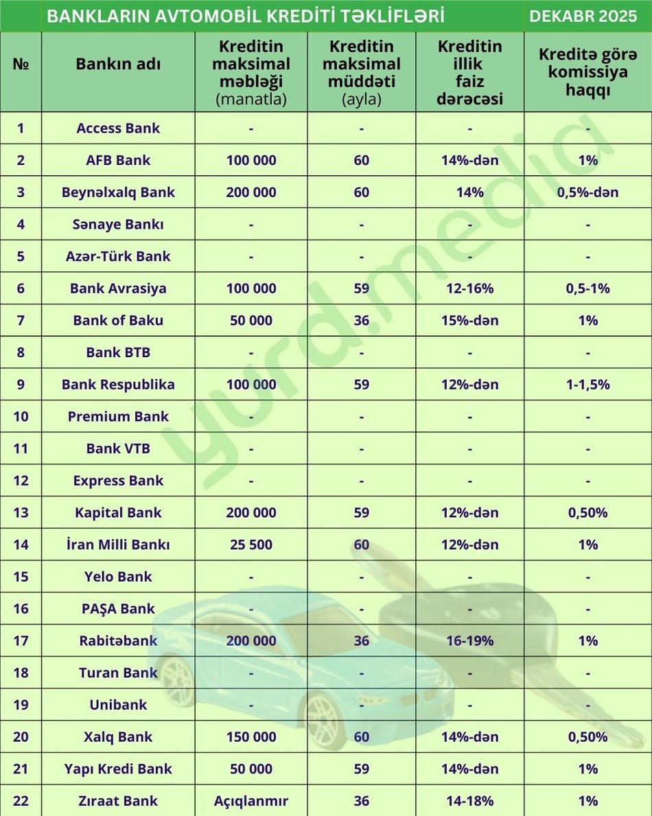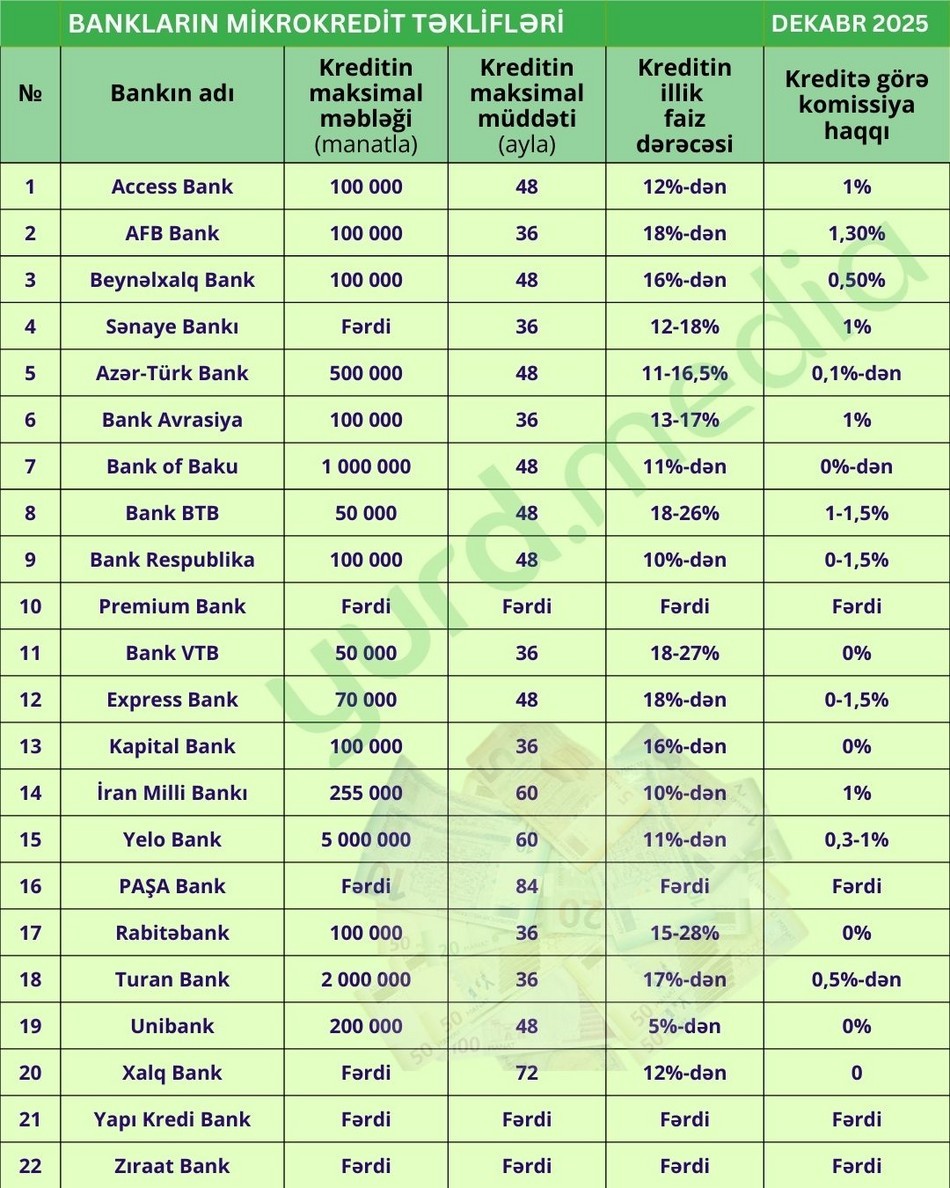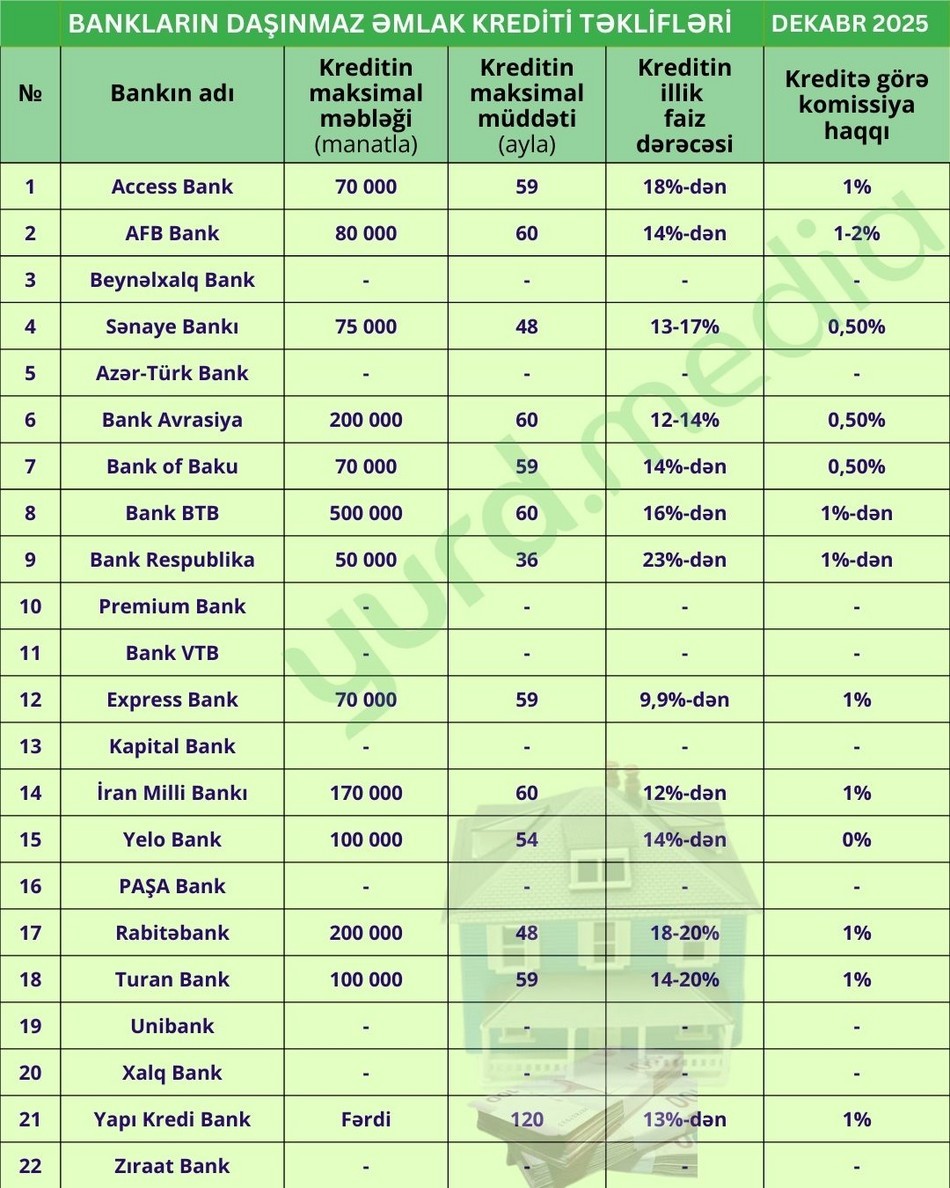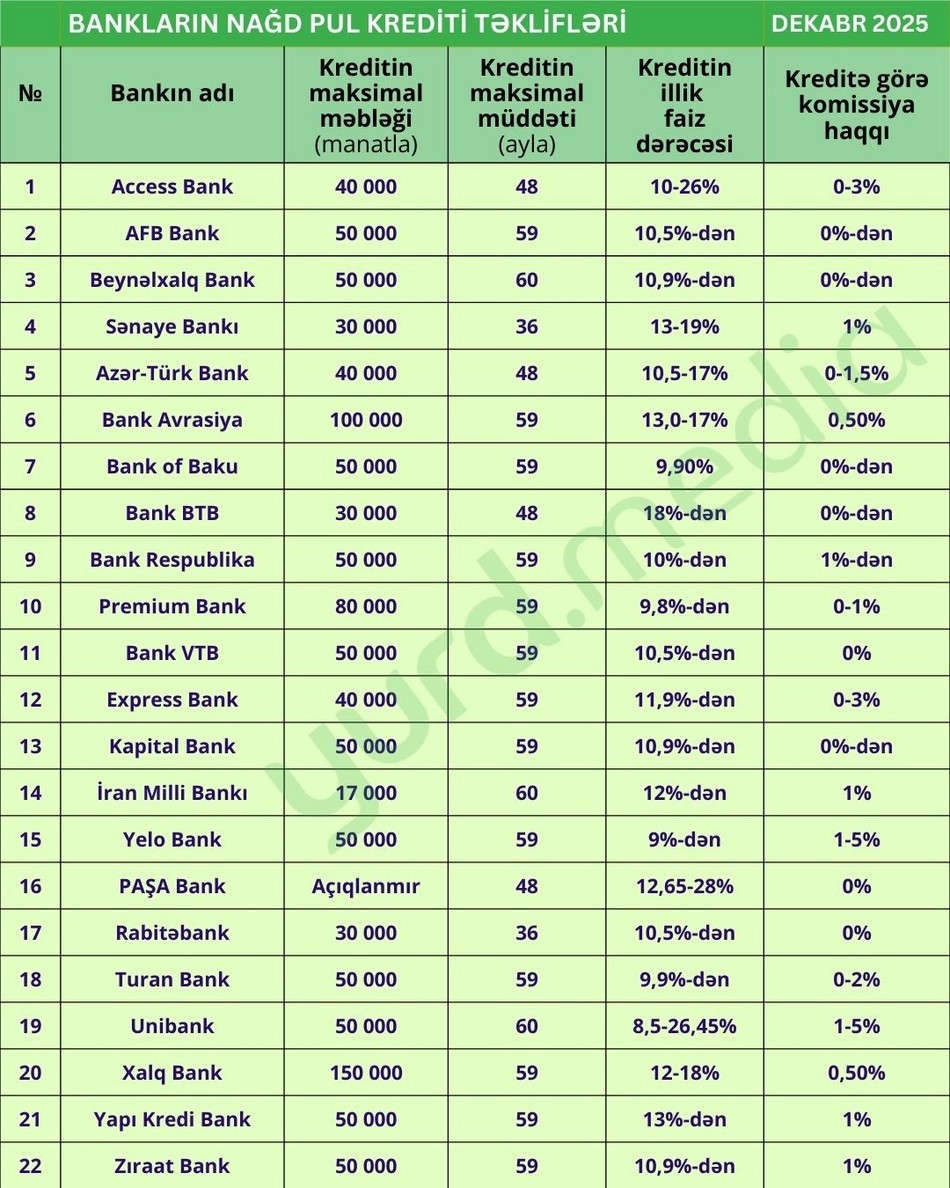 Yurd.Media dekabrın ilk yarısında Azərbaycan banklarının əsas kredit növləri üzrə təkliflərini araşdırıb.