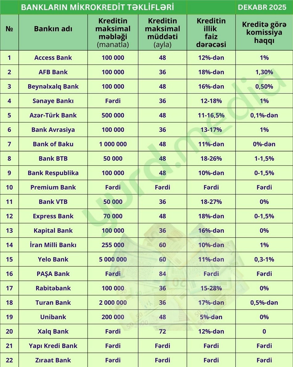 Bankların mikrokredit ilə bağlı təkliflərini daha detallı təqdim edirik:
