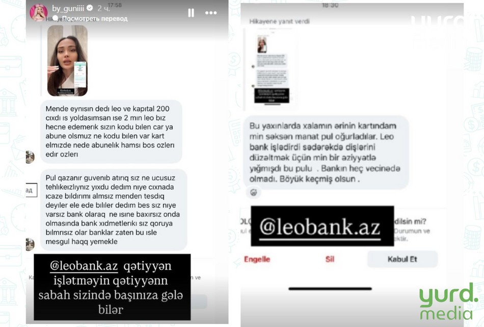 Yurd.Media xəbər verir ki, "by_güniii" adlı bloger blokda saxladığı "Leobank" kartından 200 manat vəsaitin oğurlandığını, bankın isə məsələ ilə bağlı heç bir tədbir görmədiyini deyir.