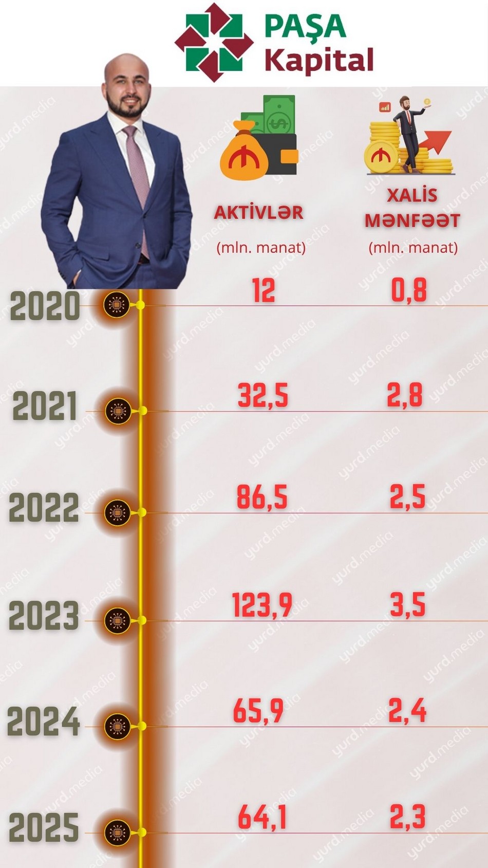 Bu illər ərzində “PAŞA Kapital”ın xalis mənfəəti həm artıb, həm də azalıb. Belə ki, investisiya şirkəti 2019-cu ildə 0,8 milyon manat, 2020-ci ildə 2,8 milyon manat, 2021-ci ildə 2,5 milyon manat, 2022-ci ildə 3,5 milyon manat, 2023-cü ildə 2,4 milyon manat, 2024-cü ildə isə 2,3 milyon manat mənfəət əldə edib.