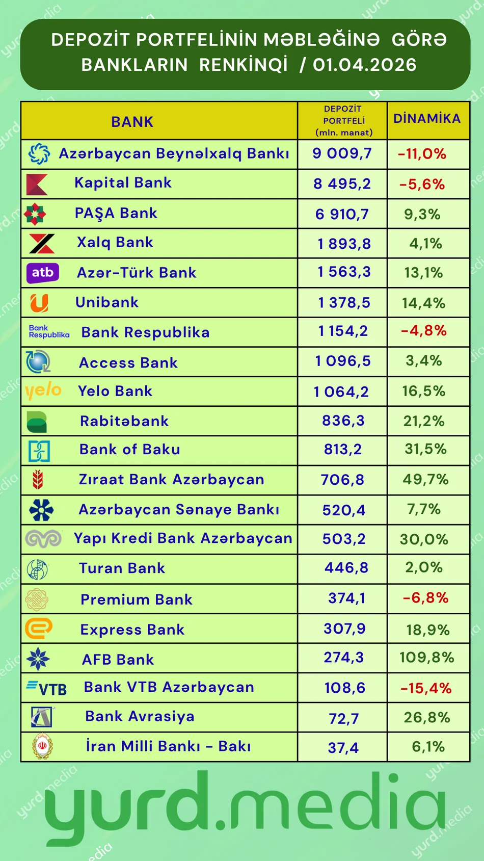 16 bankın isə depozit portfeli artıb. Ən yüksək dinamika “AFB Bank” ASC-də (2,1 dəfə), ən aşağı dinamika isə “Turan Bank” ASC-də (2%) qeydə alınıb.