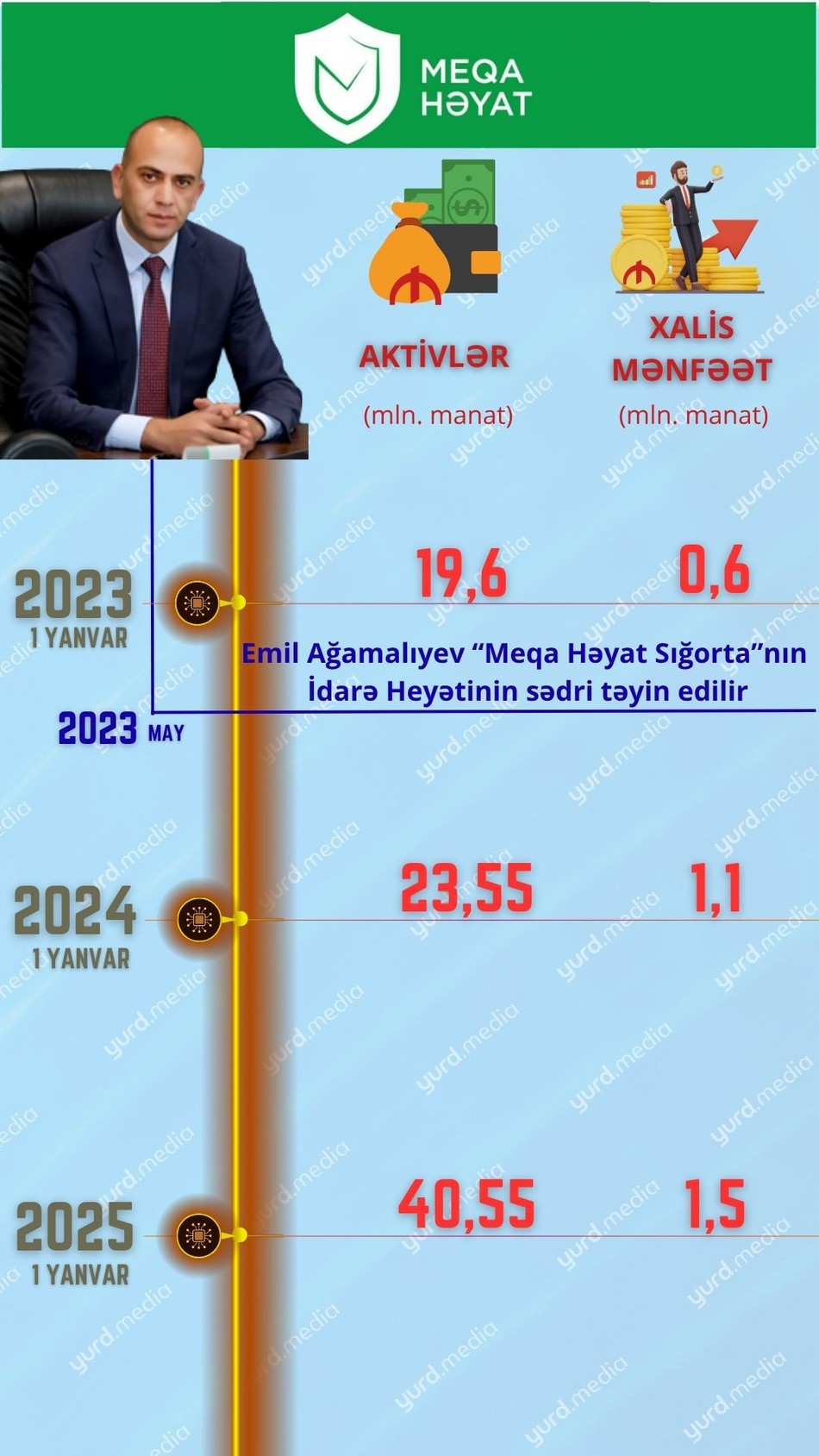 E.Ağamalıyevin dövründə “Meqa Həyat Sığorta”nın aktivləri təxminən 2 dəfə artıb. Əgər 2022-cü ilin yekununda şirkət 19,6 milyon manat aktivlərə malik olubsa, bu rəqəm 2023-cü ilin yekununda 23,55 milyon manat, 2024-cü ilin yekununda isə 40,55 milyon manat təşkil edib.
