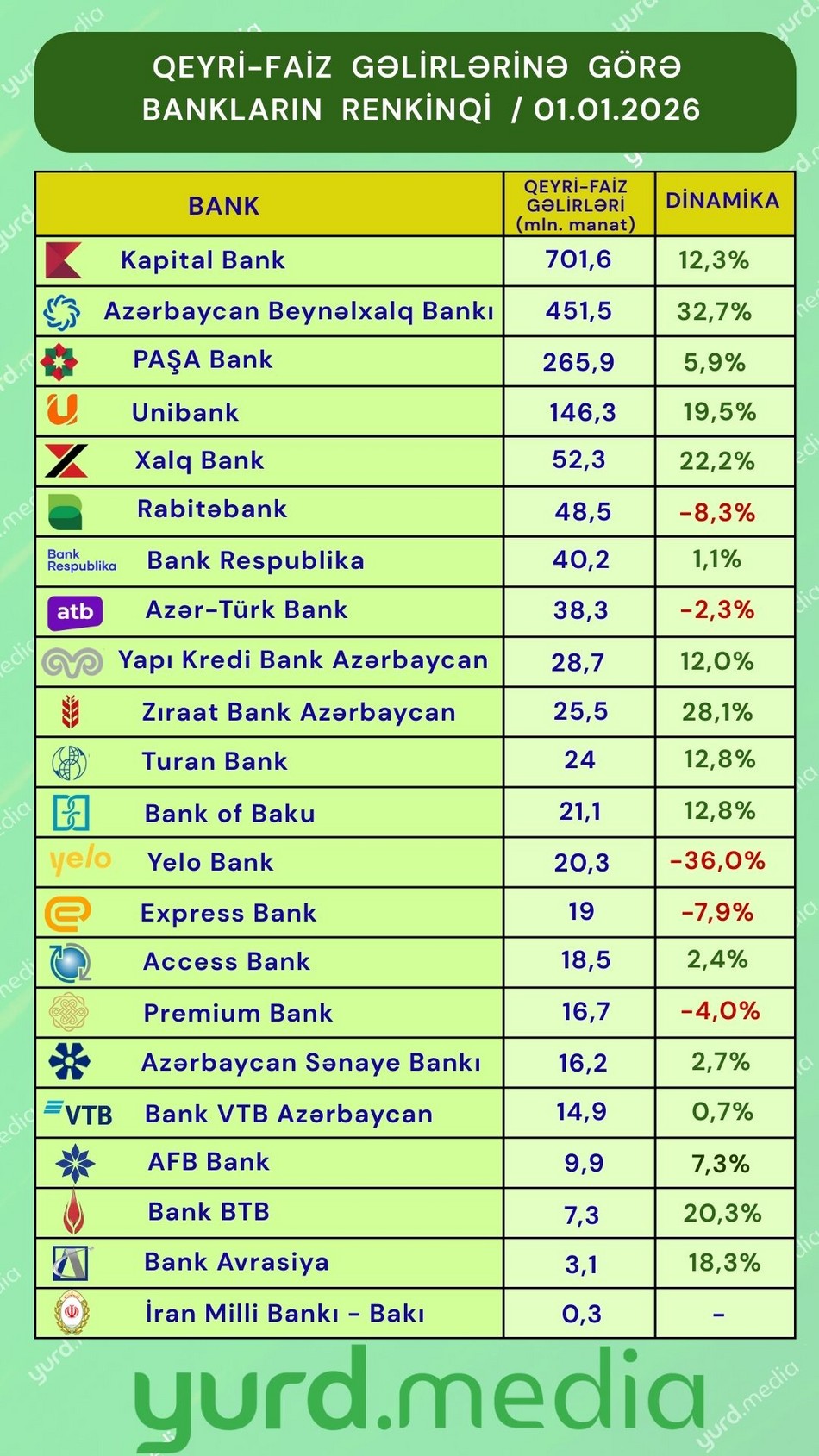 16 bankın isə qeyri-faiz gəlirləri artıb. Ən yüksək dinamika ABB-də (32,7%), ən aşağı dinamika isə “Bank VTB Azərbaycan”da (0,7%) qeydə alınıb.