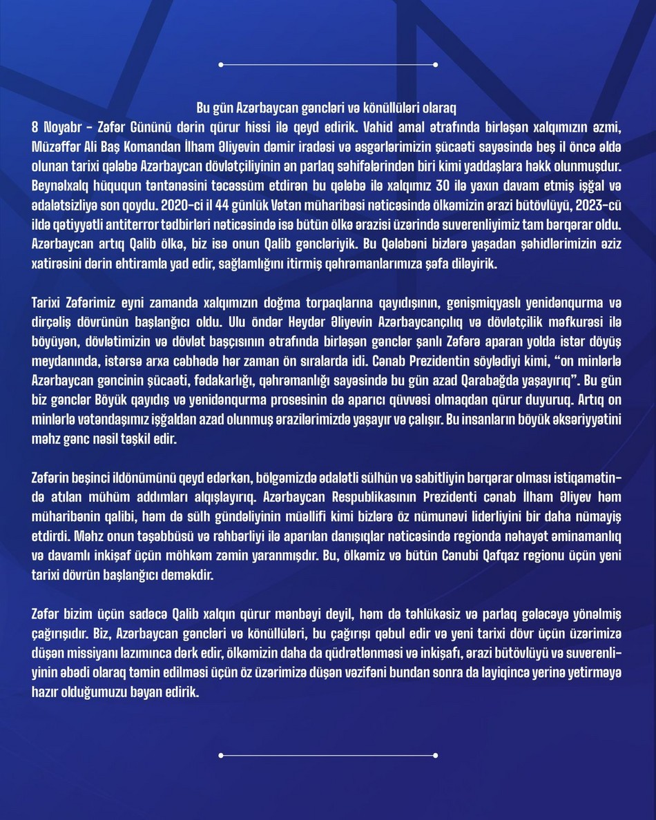 Bəyanatda qeyd olunub ki, tarixi Zəfərimiz eyni zamanda xalqımızın doğma torpaqlarına qayıdışının, genişmiqyaslı yenidənqurma və dirçəliş dövrünün başlanğıcı oldu. Ulu öndər Heydər Əliyevin Azərbaycançılıq və dövlətçilik məfkurəsi ilə böyüyən, dövlətimizin və dövlət başçısının ətrafında birləşən gənclər şanlı Zəfərə aparan yolda istər döyüş meydanında, istərsə arxa cəbhədə hər zaman ön sıralarda idi: