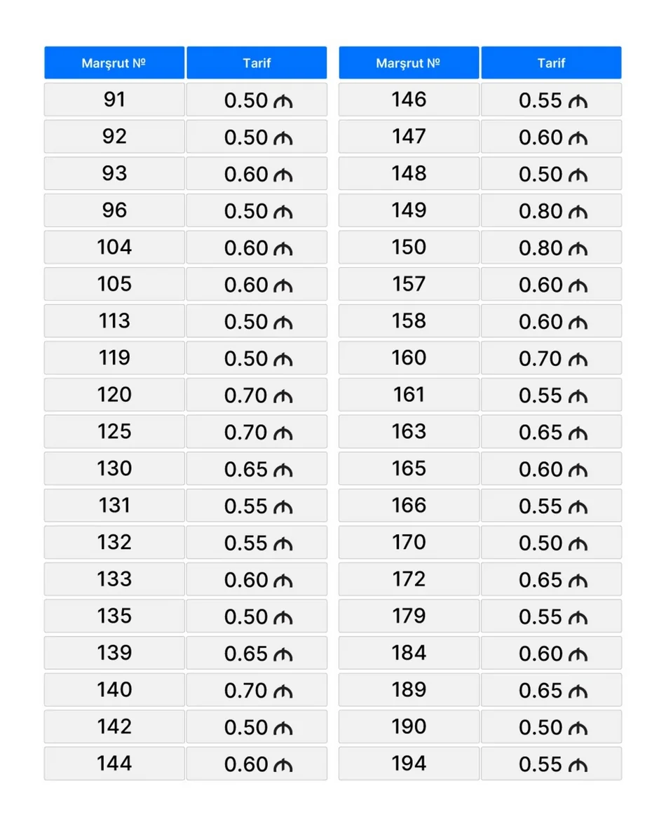 Rəqəmsal İnkişaf və Nəqliyyat Nazirliyi yanında Azərbaycan Yerüstü Nəqliyyat Agentliyi (AYNA) Bakı və paytaxtətrafı avtobuslarda yeni qiymətlər müəyyənləşdirib.