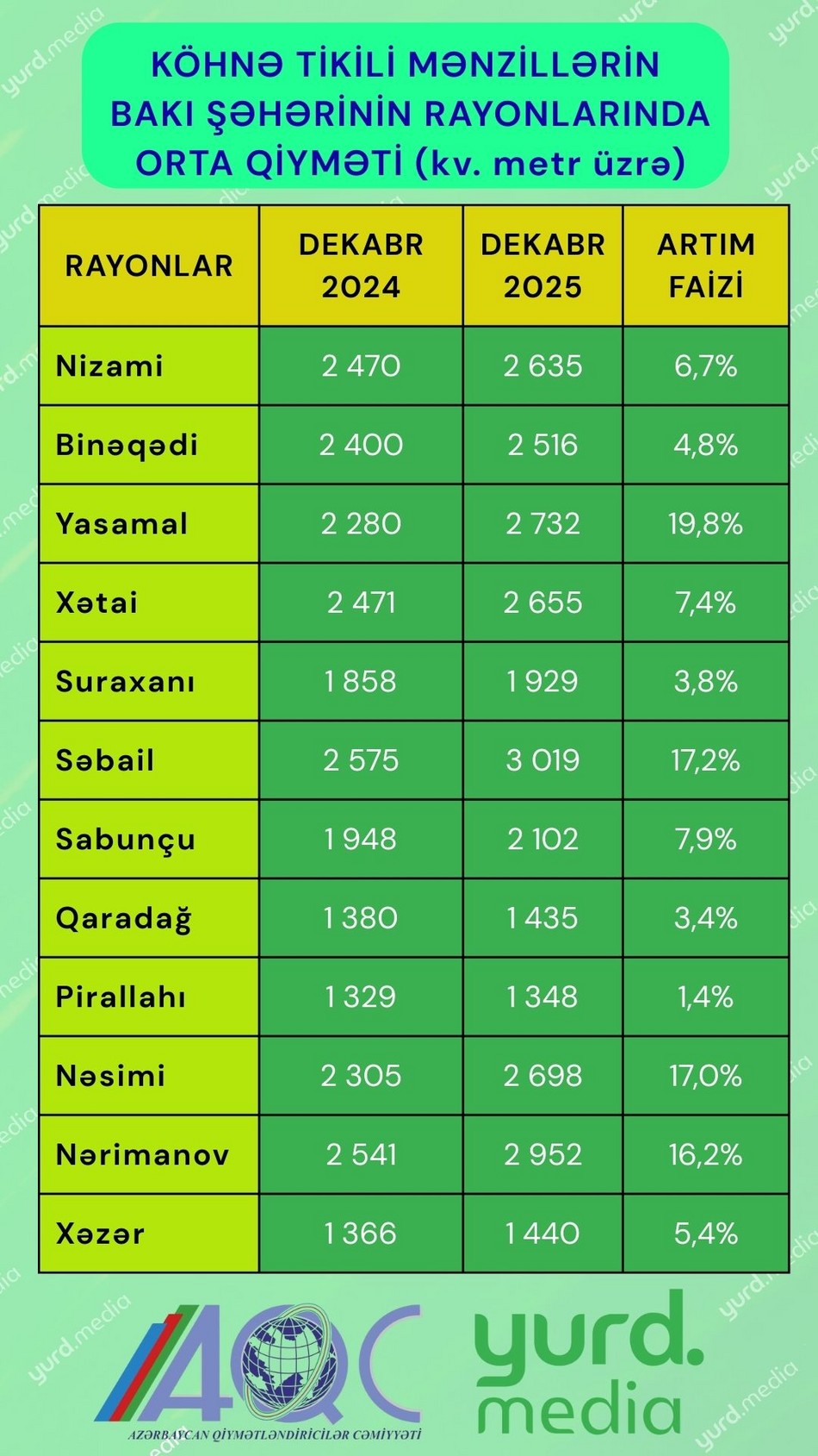 "Azərbaycan Qiymətləndiricilər Cəmiyyəti"nin (AQC) araşdırmasına görə, ən sürətli bahalaşma Yasamal (19,8%), Səbail (17,2%), Nəsimi (17%) və Nərimanov (16,2%) rayonlarında qeydə alınıb.