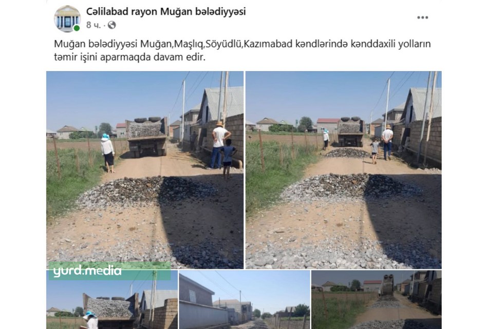Buna baxmayaraq qurum materialları "Muğan bələdiyyəsi Muğan, Maşlıq, Söyüdlü, Kazımabad kəndlərində kənddaxili yolların təmir işini aparmaqda davam edir" başlığı ilə təqdim edir.