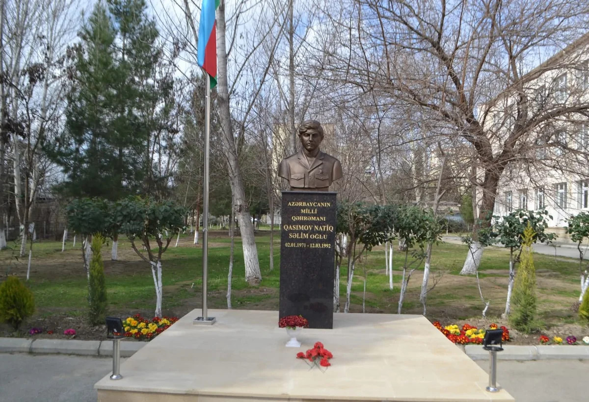 İlk olaraq məktəbin önündə ucaldılmış Milli Qəhrəman Natiq Qasımovun büstünün önünə güllər düzülüb.