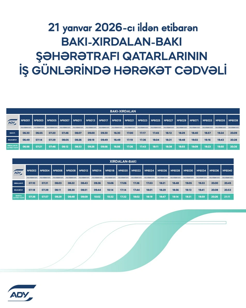 "Azərbaycan Dəmir Yolları" QSC-dən (ADY) Yurd.Media-ya bildirilib ki, yanvarın 21-dən Abşeron dairəvi dəmir yolu marşrutu üzrə qatarların hərəkət cədvəlində dəyişikliklər ediləcək.