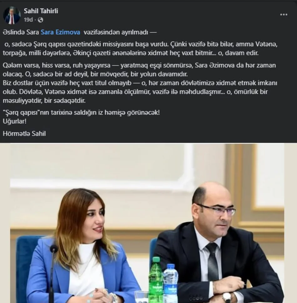 O vurğulayıb ki, əslində Sara Əzimova vəzifəsindən ayrılmadı - o, sadəcə Şərq qapısı qəzetindəki missiyasını başa vurdu: