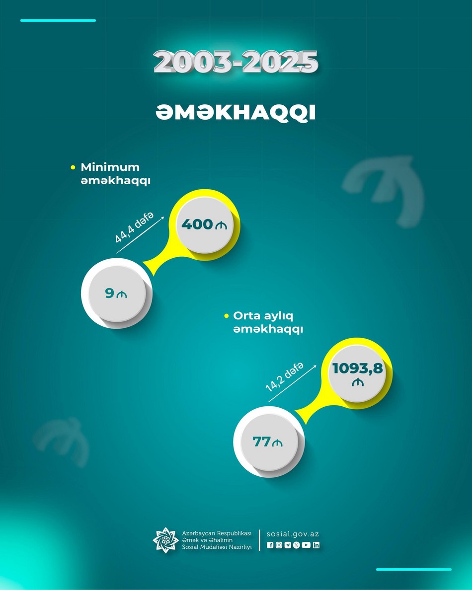 “Ümumilikdə 2018-2025-ci illərdə ölkəmizdə 5 sosial islahat paketi icra olunub. İllik əlavə 7,6 milyard manat vəsait ayılan bu islahat paketləri 4 milyon vətəndaşı əhatə edib və bu islahatlar nəticəsində qeyd edilən dövrdə minimum pensiya 2,9 dəfə, minimum əməkhaqqı 3,1 dəfə, sosial müavinət, təqaüd ödənişləri üçün illik vəsait 5 dəfə artıb. Orta aylıq pensiya 2,6 dəfə artaraq 208 manatdan 540 manata, o cümlədən yaşa görə orta aylıq pensiya 2,5 dəfə artaraq 234 manatdan 576 manata çatıb”.