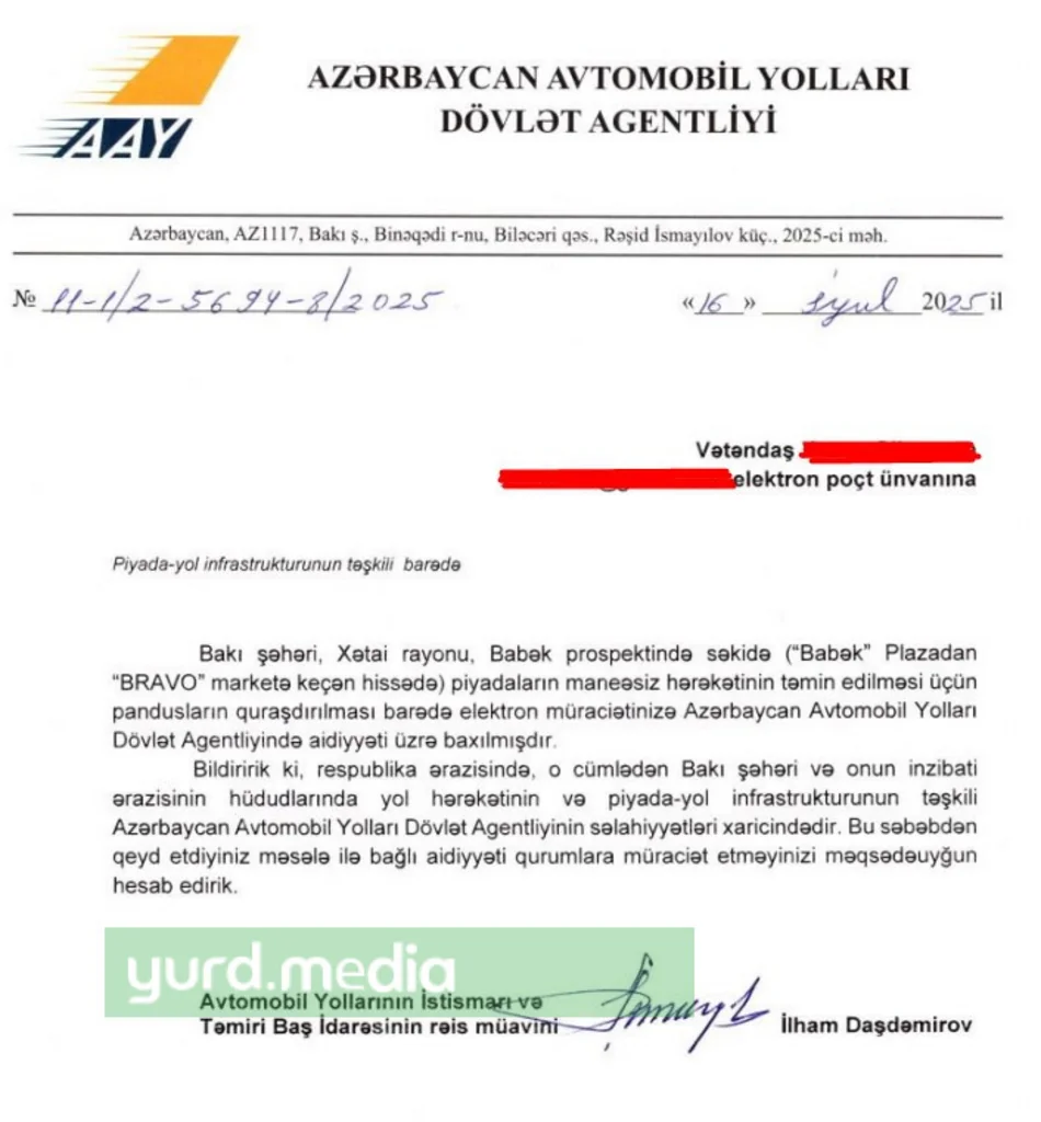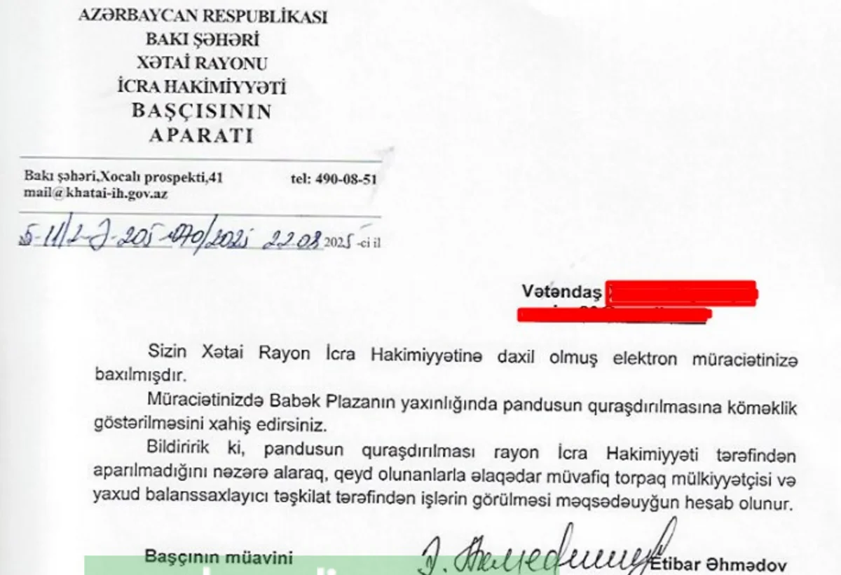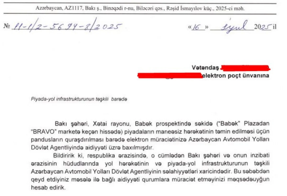 Belə ki, Azərbaycan Avtomobil Yolları Dövlət Agentliyi müraciətə cavabında problemin onların səlahiyyətində olmadığını bildirib və digər qurumlara müraciət edilməsini tövsiyə edib. Xətai rayon İcra Hakimiyyəti isə pandusun quraşdırılmasının onların tərəfindən həyata keçirilmədiyini qeyd edərək məsuliyyəti torpaq mülkiyyətçisi və ya balanssaxlayıcı təşkilatın üzərinə yönləndirib.