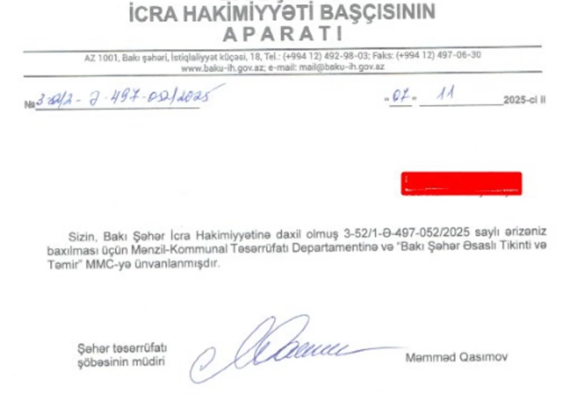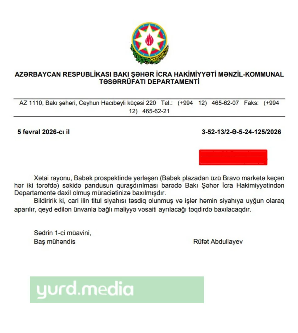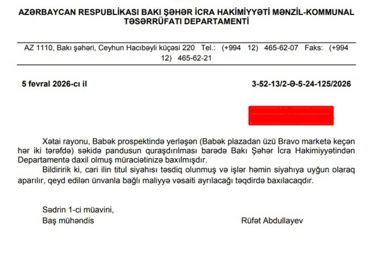 Bakı şəhər İcra Hakimiyyəti müraciəti tabeliyindəki “Əsaslı Tikinti və Təmir” MMC və Mənzil-Kommunal Təsərrüfatı Departamentinə göndərib. Həmin qurumlardan isə bildirilib ki, məsələ yalnız növbəti illər üçün ayrılacaq maliyyə vəsaitindən asılı olaraq nəzərdən keçirilə bilər.