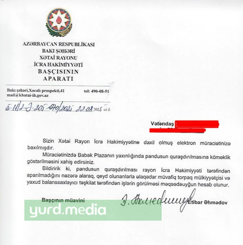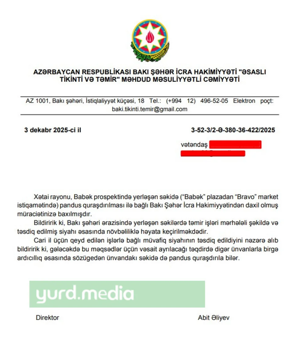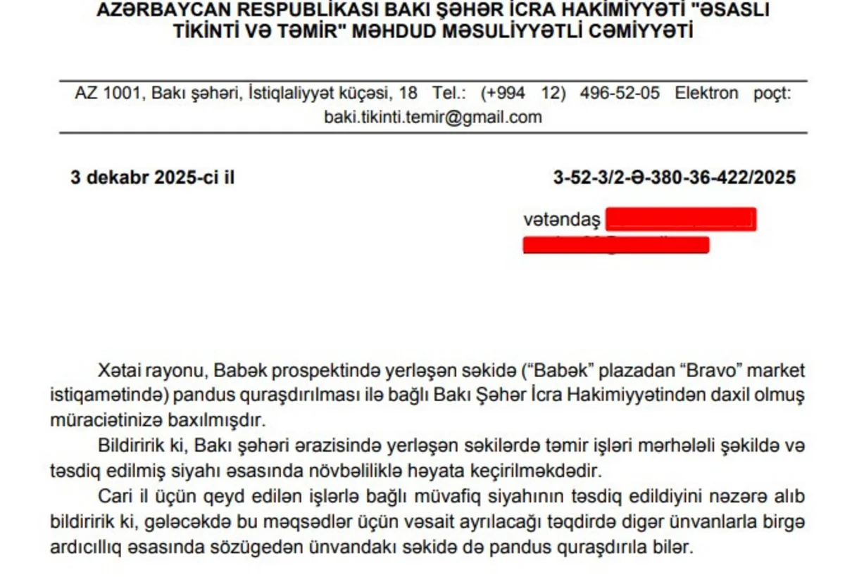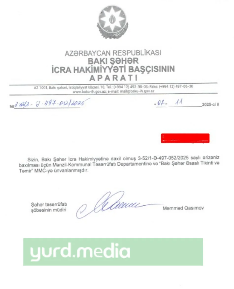 Bakı şəhər İcra Hakimiyyəti müraciəti tabeliyindəki “Əsaslı Tikinti və Təmir” MMC və Mənzil-Kommunal Təsərrüfatı Departamentinə göndərib. Həmin qurumlardan isə bildirilib ki, məsələ yalnız növbəti illər üçün ayrılacaq maliyyə vəsaitindən asılı olaraq nəzərdən keçirilə bilər.