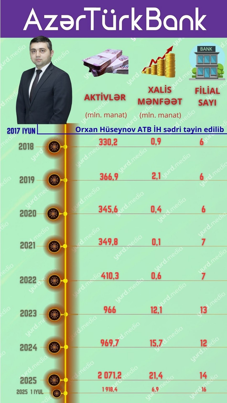 O.Qarayevin dövründə “Turan Bank”ın aktivləri təxminən 12% artıb. Əgər 2024-cü ilin yekununda Bank 847 milyon manatlıq aktivlərə malik olubsa, bu rəqəm bu il iyulun 1-nə isə 948 milyon manat təşkil edib.