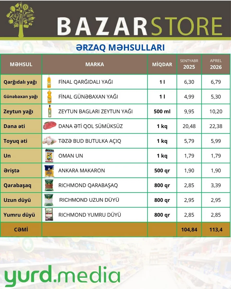 Hazırki infoqrafika "Bazarstore" şəbəkəsində əsas ərzaq məhsullarının qiymətini əks etdirir. Səbətdə şəkər, duz,çay, yumurta, ağartə məhsulları, yağlar, ət, un, makaron, dənli-paxlalı məhsulların ən geniş istifadə olunan çeşidləri seçilib. 2025-ci ilin sentyabr ayında təqdim etdiyimiz qiymət cədvəli ilə müqayisədə bu məhsulların qiyməti 8,5 faiz artım müşahidə olunur.