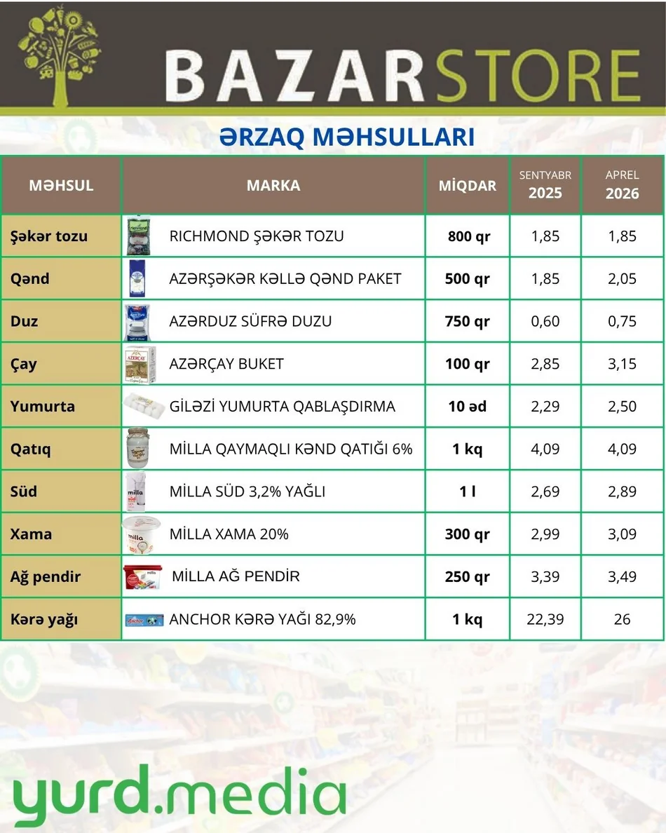 Azərbaycanda əhalinin gündəlik istehlak səbətinə daxil olan əsas ərzaq və gündəlik tələbat məhsullarının qiymətlərinin aparıcı marketlər şəbəkəsi üzrə müqayisəli təhlilini əks etdirən araşdırmalardır. Yurd.Media tərəfindən mütəmadi hazırlanan bu materiallarda illik qiymət dəyişiklikləri, bazar dinamikası və istehlakçı büdcəsinə təsir edən əsas tendensiyalar təqdim olunur.