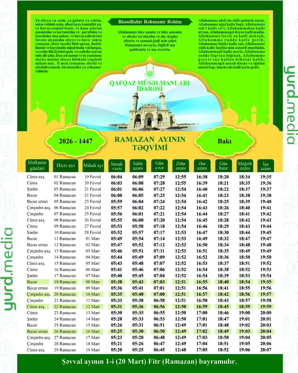 Bu il üçün Ramazan ayının təqvimi hazırlanıb.