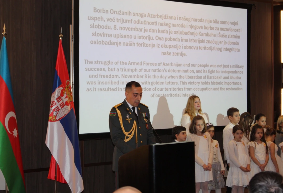Qəbulda Azərbaycan və Serbiya arasında strateji tərəfdaşlıq münasibətlərinin yüksək səviyyədə olduğu vurğulanıb və Serbiya Prezidenti Aleksandar Vuçiçin gələn il Bakıya gözlənilən səfərinin iki ölkə arasındakı əməkdaşlığa yeni təkan verəcəyinə inam ifadə olunub. Azərbaycan Silahlı Qüvvələrinin Serbiya Respublikasındakı hərbi attaşesinin baş köməkçisi kapitan Cəfər Məmmədov qeyd edib ki, 8 Noyabr – Zəfər Günü Azərbaycan xalqı və dövlətinin 2020-ci ilin 44 günlük Vətən müharibəsində qazandığı tarixi qələbənin, ölkəmizin ərazi bütövlüyünün və suverenliyinin bərpasının, xalqımızın azadlıq və ədalət uğrunda mübarizəsinin parlaq təcəssümü, həmçinin milli birliyin və qürurun rəmzidir.