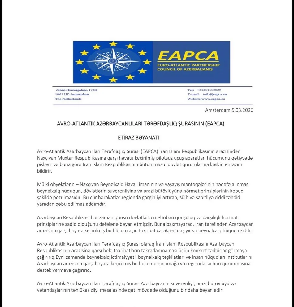Avro-Atlantik Azərbaycanlılar Tərəfdaşlıq Şurası (EAPCA) İran İslam Respublikasının ərazisindən Naxçıvan Muxtar Respublikasına qarşı həyata keçirildiyi bildirilən pilotsuz uçuş aparatları hücumunu qətiyyətlə pisləyib.